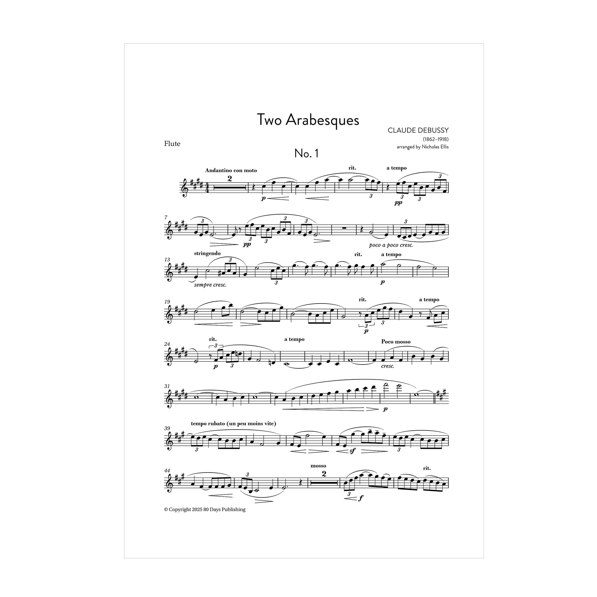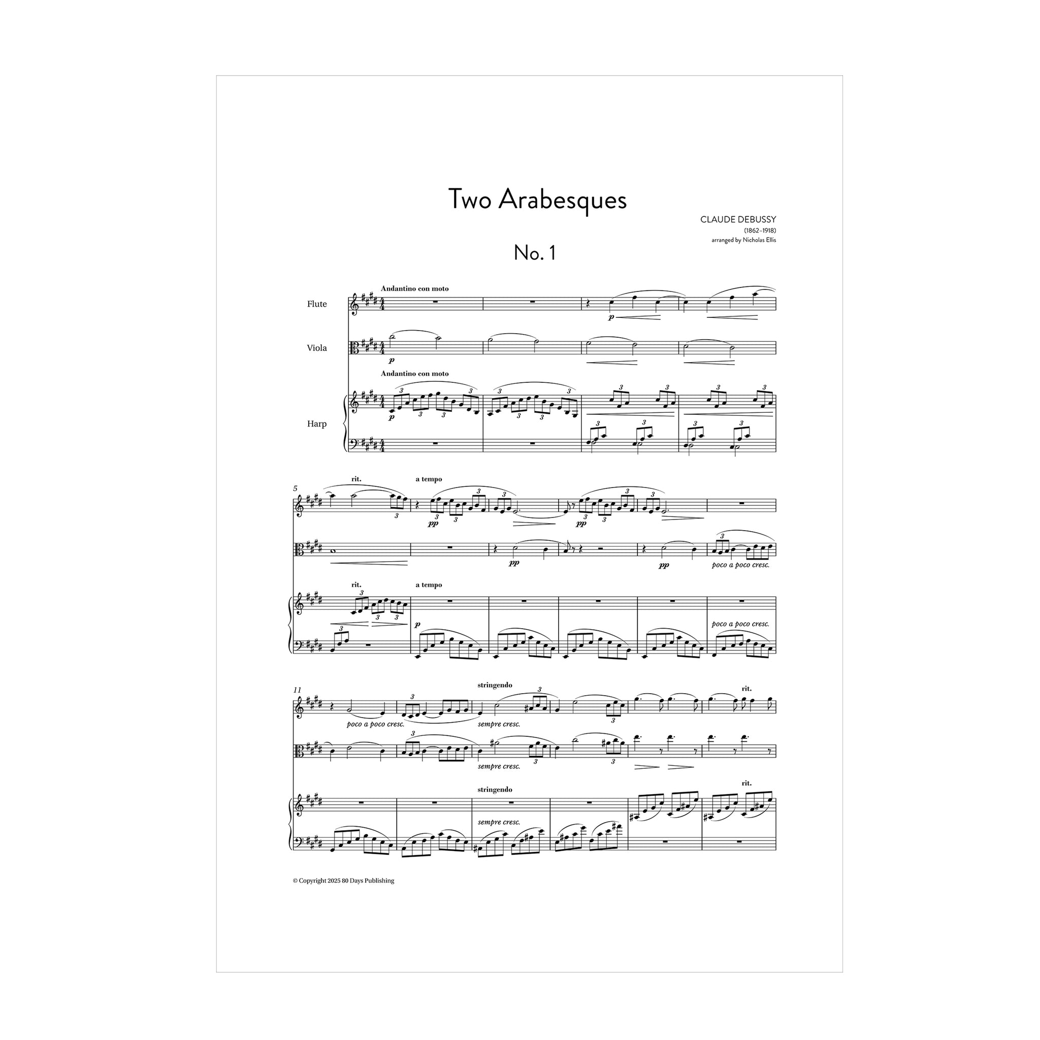 Composed in the late 1880s, Debussy’s Deux Arabesques are among his earliest piano works, already hinting at the impressionistic language that would later define him. Their flowing lines and delicate shifts of harmony create music of ornamental grace, true to the title’s suggestion of fluid, decorative design. In this arrangement written for the Korros Ensemble, the harp takes on the piano’s rippling textures with natural ease, while the flute and viola/clarinet add new shades of lyricism and warmth. The combination refracts Debussy’s youthful charm through instrumental colours he would himself later explore in his Sonata for Flute, Viola, and Harp — making this trio feel at once fresh and entirely authentic.